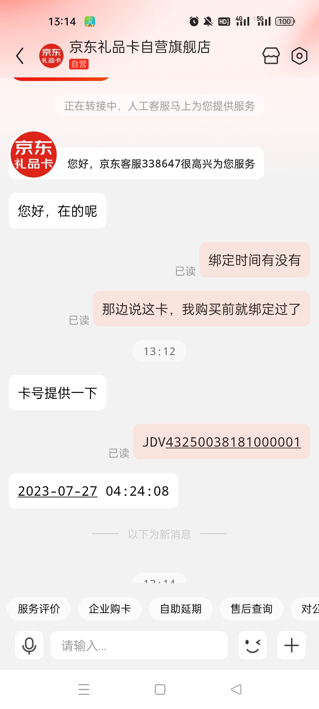 直接黑100京东e卡,一开始说22分被绑定了,我23分才京东下单的,笑死我了,白天问京东说24分被绑定了,