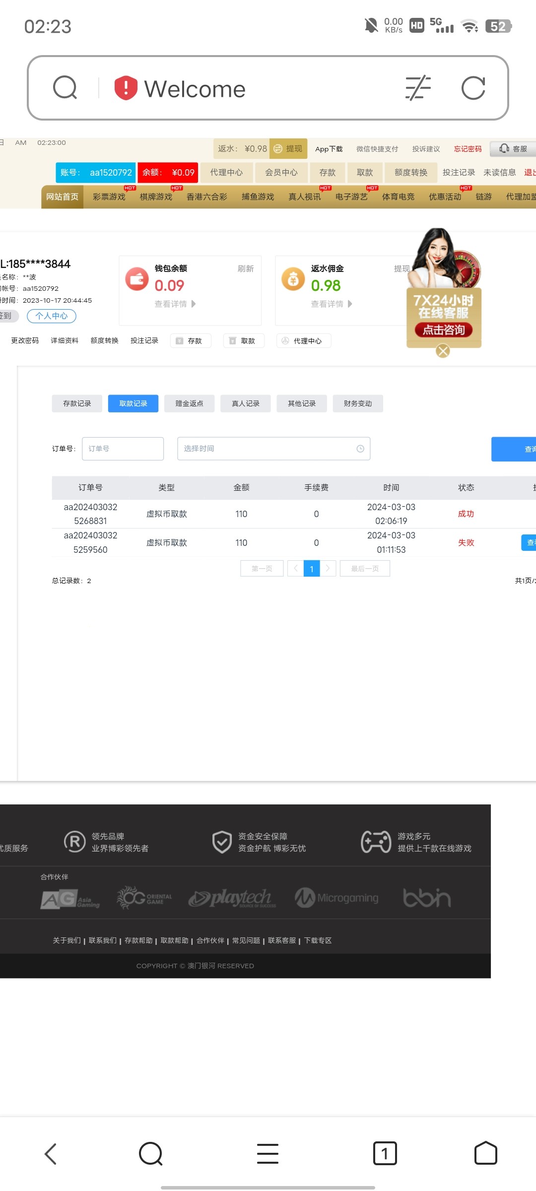 银河7180,有史以来遇到的最恶心的黑网,充300进去 没申请任何优惠 赢了700 出款1000 刚开始说不支持钱能钱包出款,后面问客服改成vip钱包取款,再次提交还是不出款,继续问客服 说我账号活跃度不够,你妈 我才注册开户2天 又没有申请你任何彩金,找的借口简直太侮辱智商了 最后实在没办法了,故意输到100了 去提交出款还是不给出