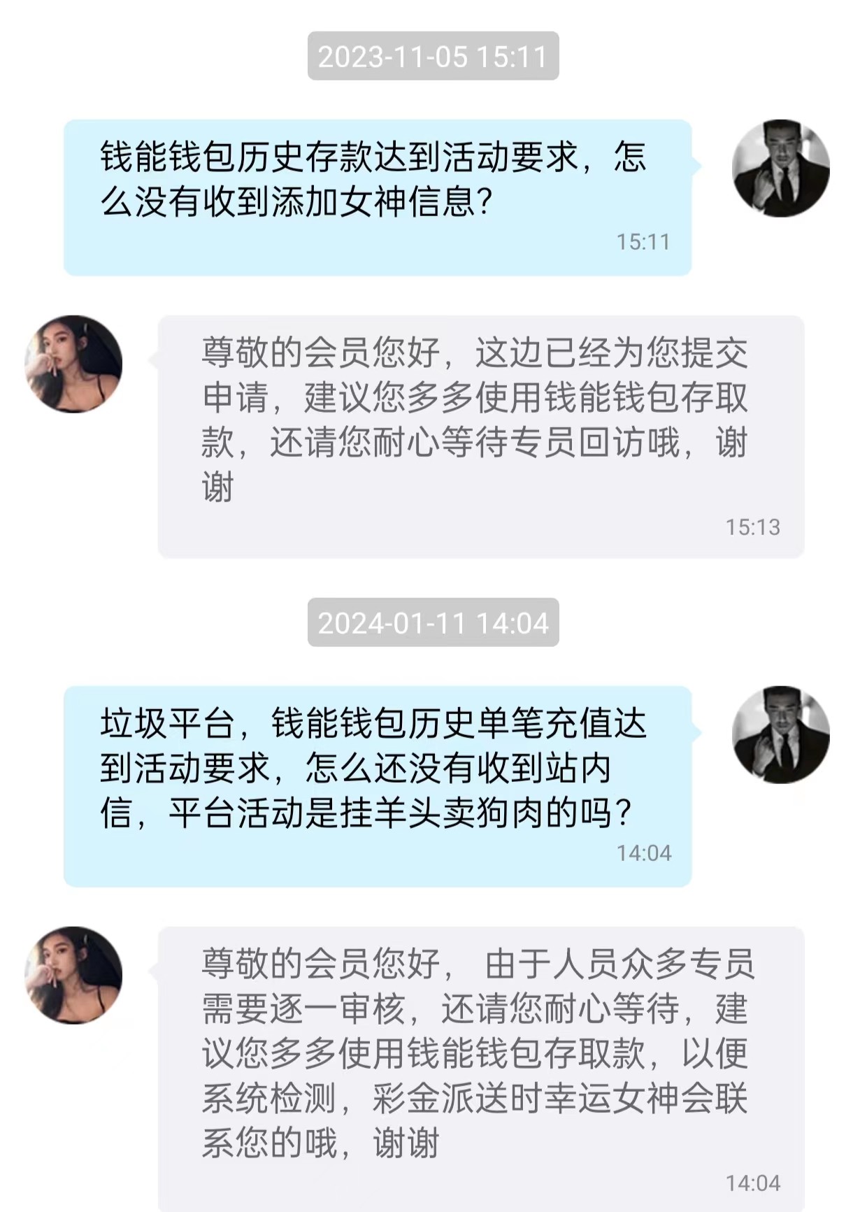5157假活动,女神账号都添加了,都没有送,说是要看站内信截图