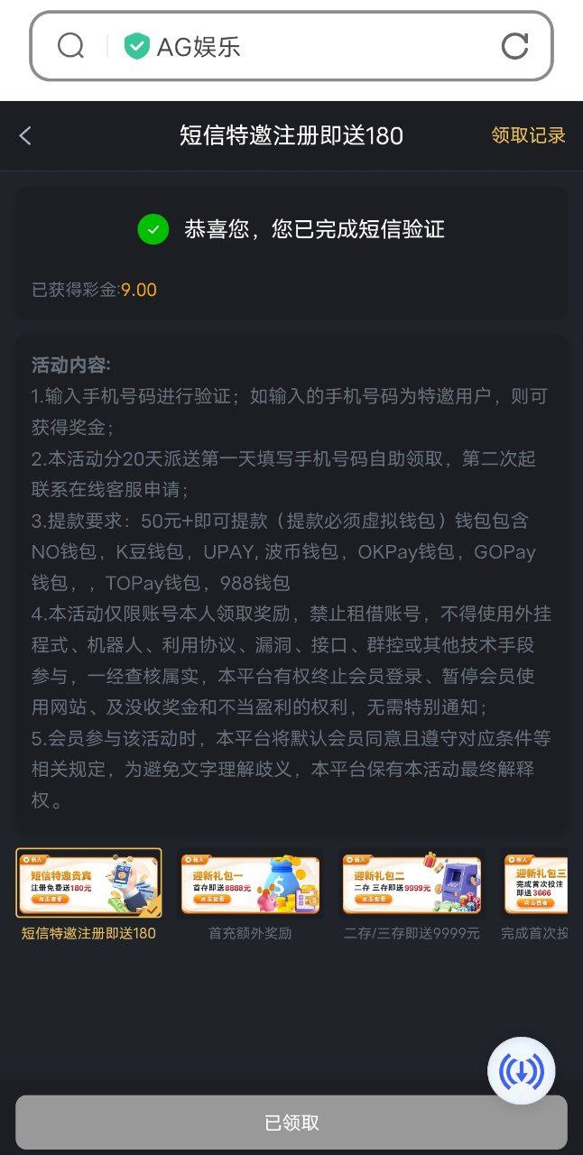 优惠完成短信验证领取9元,第二天找客服在申请9元,彩金无限制满足50电子钱包出款。