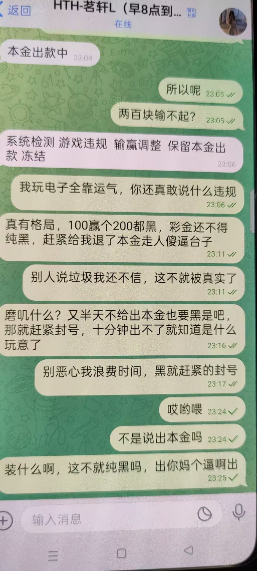 充100玩PG出300直接黑,还装模作样的说退本金,结果想都不用想这种死狗戳中痛处了知道它全家死绝没钱买棺材直接给我封号了