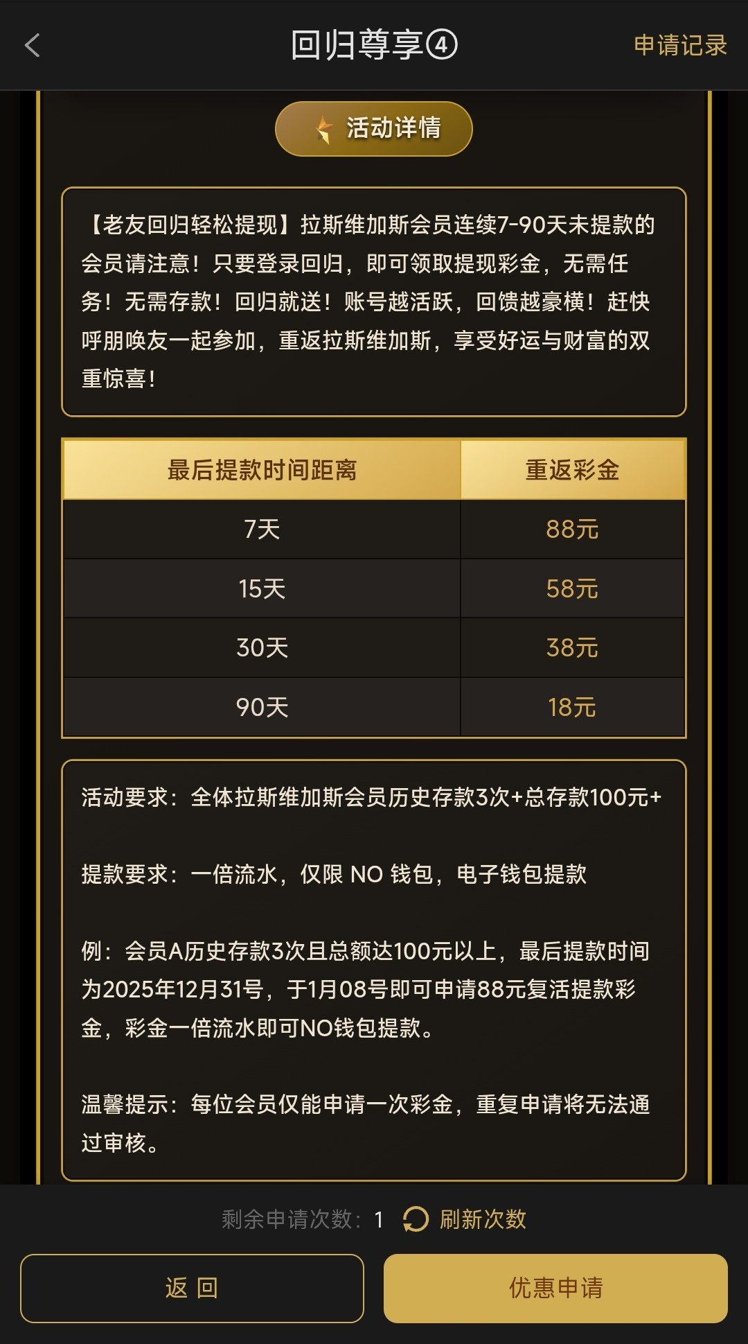 有充值过100距离最后一次提现7天以上才符合领取彩金要求,一倍流水