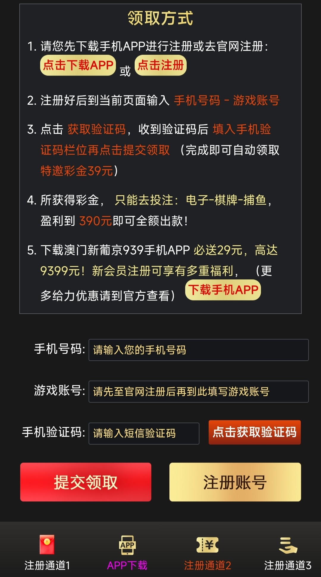注册好账号后在图一的地方领取彩金,只能娱乐:电子/捕鱼/棋牌,需盈利至390才能取款