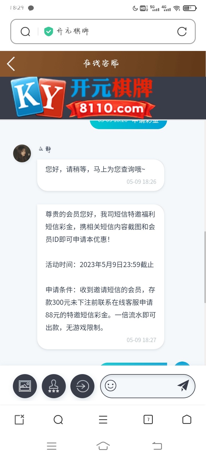 申请条件:收到邀请短信的会员,存款300元未下注前联系在线客服申请88元的特邀短信彩金。一倍流水即可出款,无游戏限制。