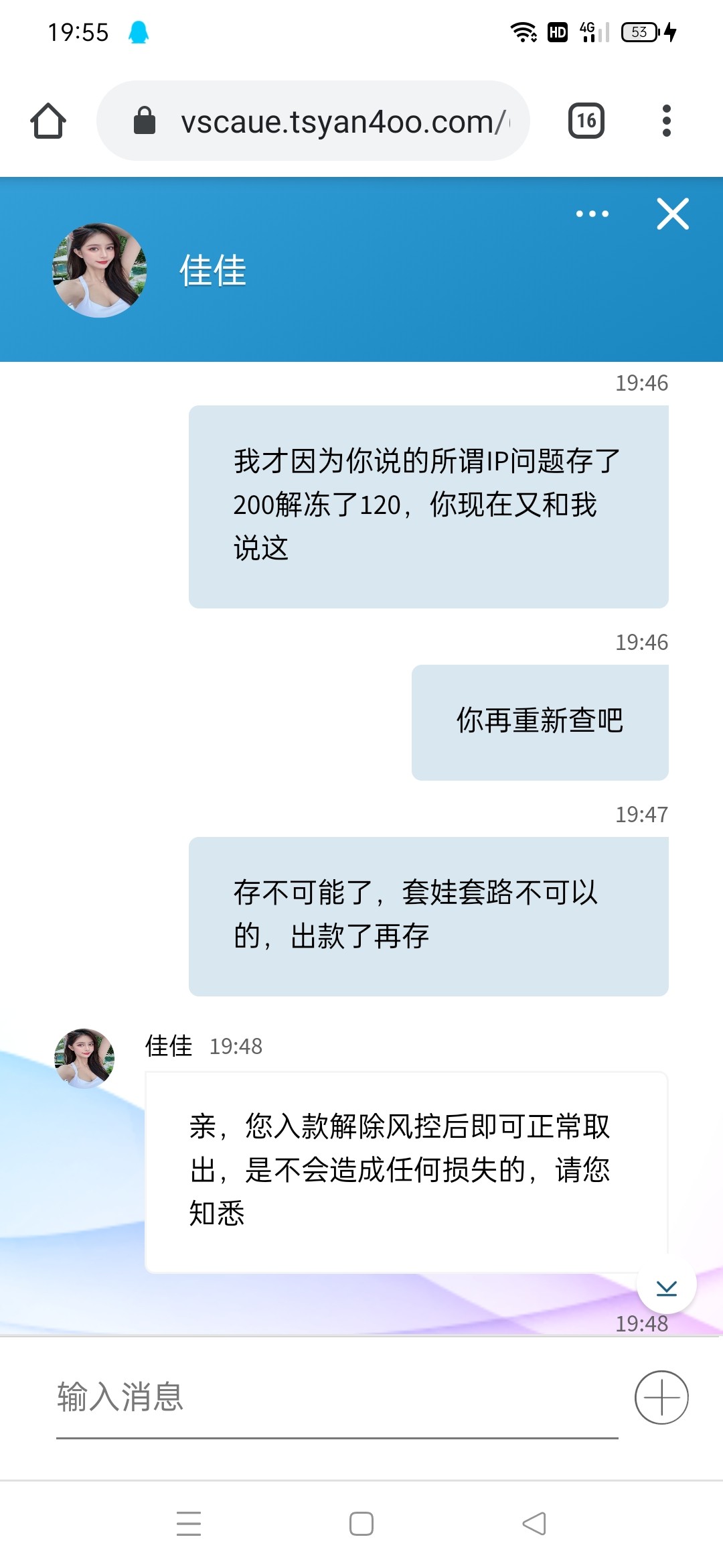前面打电话送了6块钱,打到120出款说IP风险要我村120解冻,存了200打到1000出款又说IP风险存500解冻,给我气笑了,曹尼玛了个臭傻逼,一流直播所有工作人员不得好死!网址1616.tv