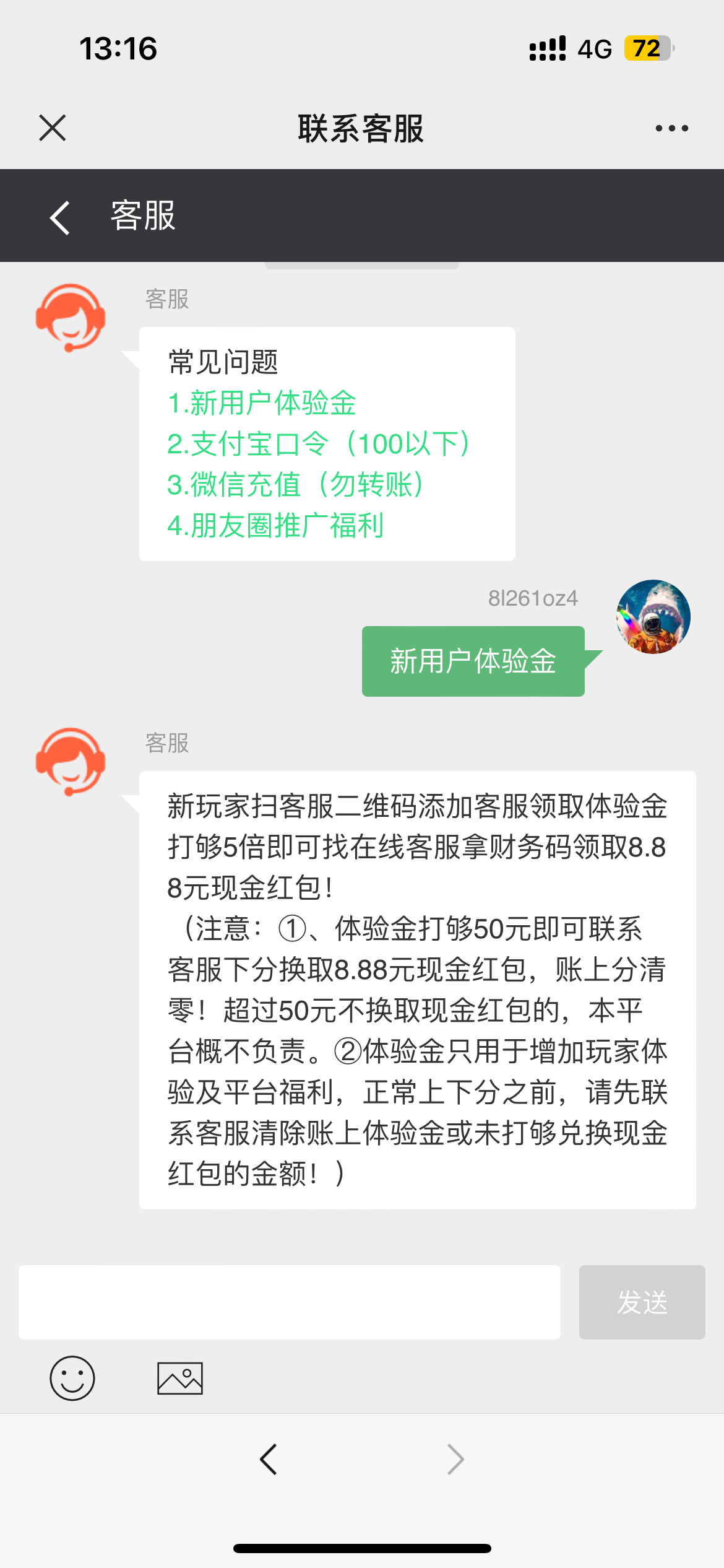 找客服 有一个新用户体验金