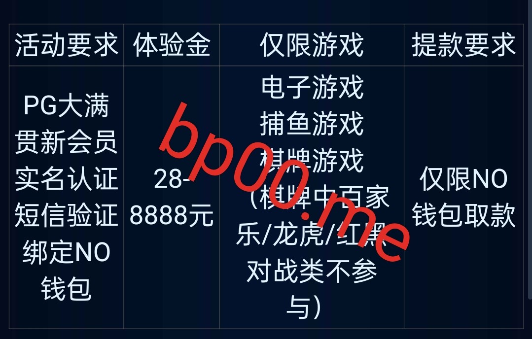 下载APP注册绑定银行卡手机号和NO钱包,24小时内送!或者可以联系客服试试!限制:电子/棋牌/捕鱼(棋牌不能玩红蓝百家乐龙虎)