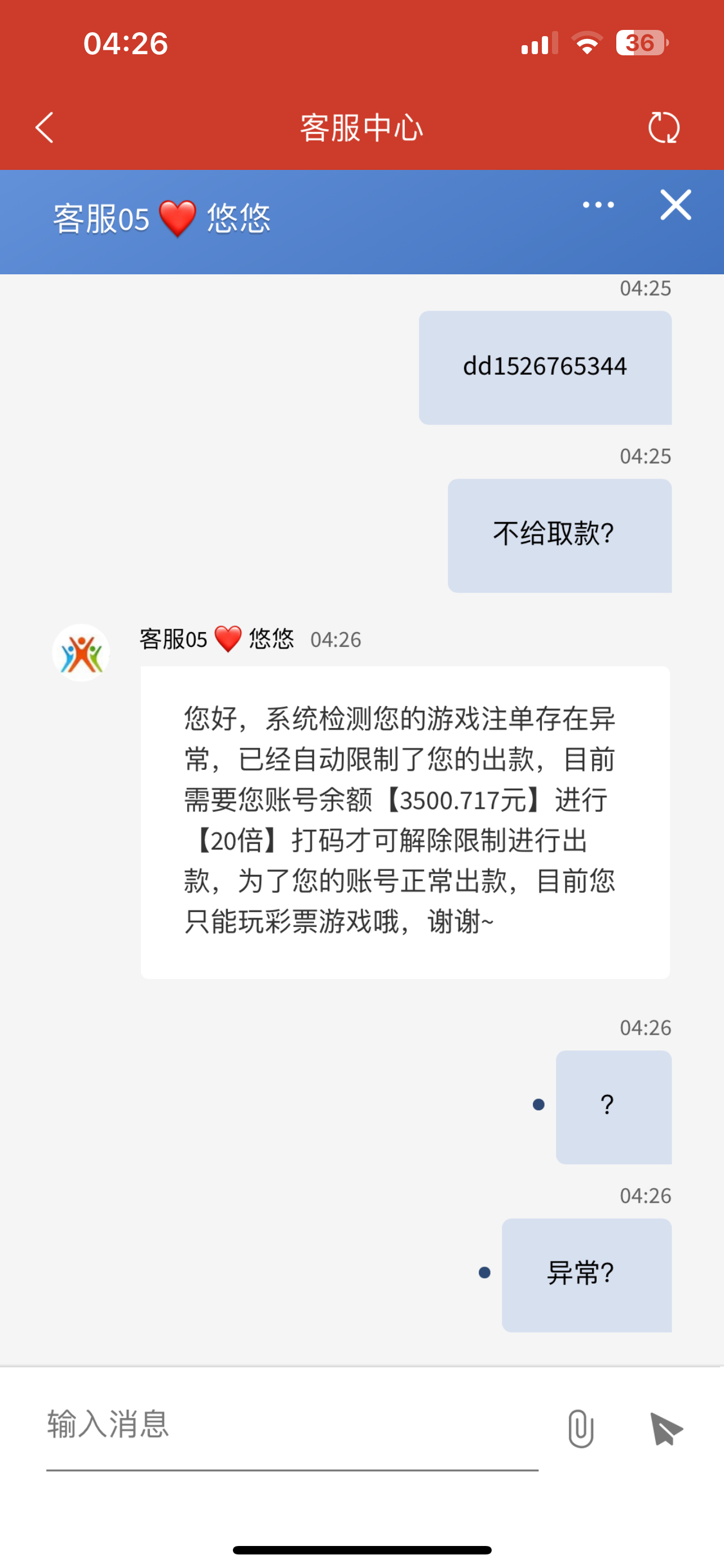 抢红包3块钱吃下级反水2块钱5块钱打上了5000块钱说我投注异常有截图直接曝光找客服让我打20倍流水提现3500让我打7万流水而且是仅限彩票