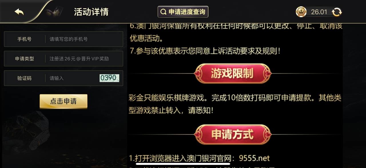 新用户下载app注册绑卡完善信息,优惠里面找到注册送彩金活动自助申请26彩金,可以去试试,领到了彩金只能打棋牌10倍水出!