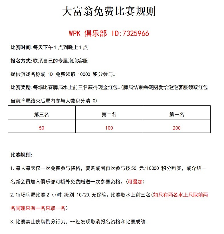 这种比赛前期都是免费的,一个人每天只能免费参加一次,首选要下载wpk链接是web.dj7r.com 要加泡泡的专员dfwkf006发你的id,然后直接说申请500彩金 这个彩金是你拿名次之后发给你的 第一名200第二名100第三名50 直接发到微信支付宝,我自己拿了一次第一名,比赛拿到前三直接发码給客服就行,里面都是真人