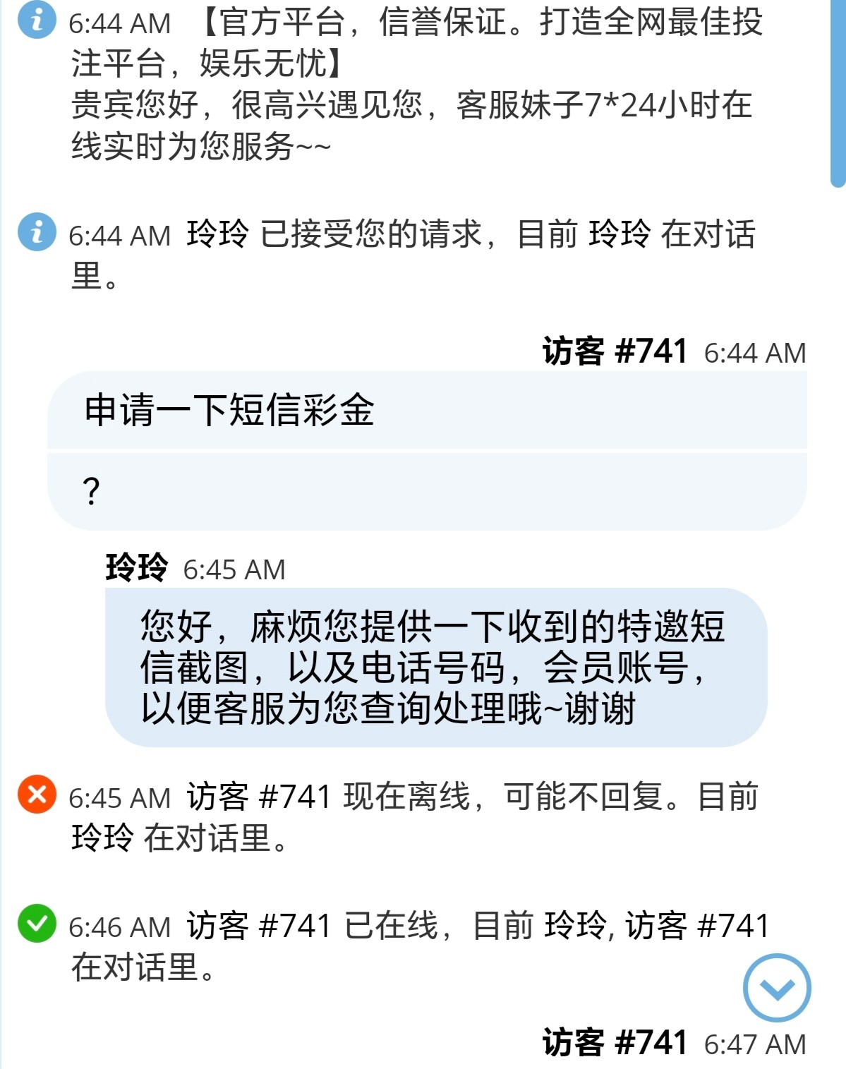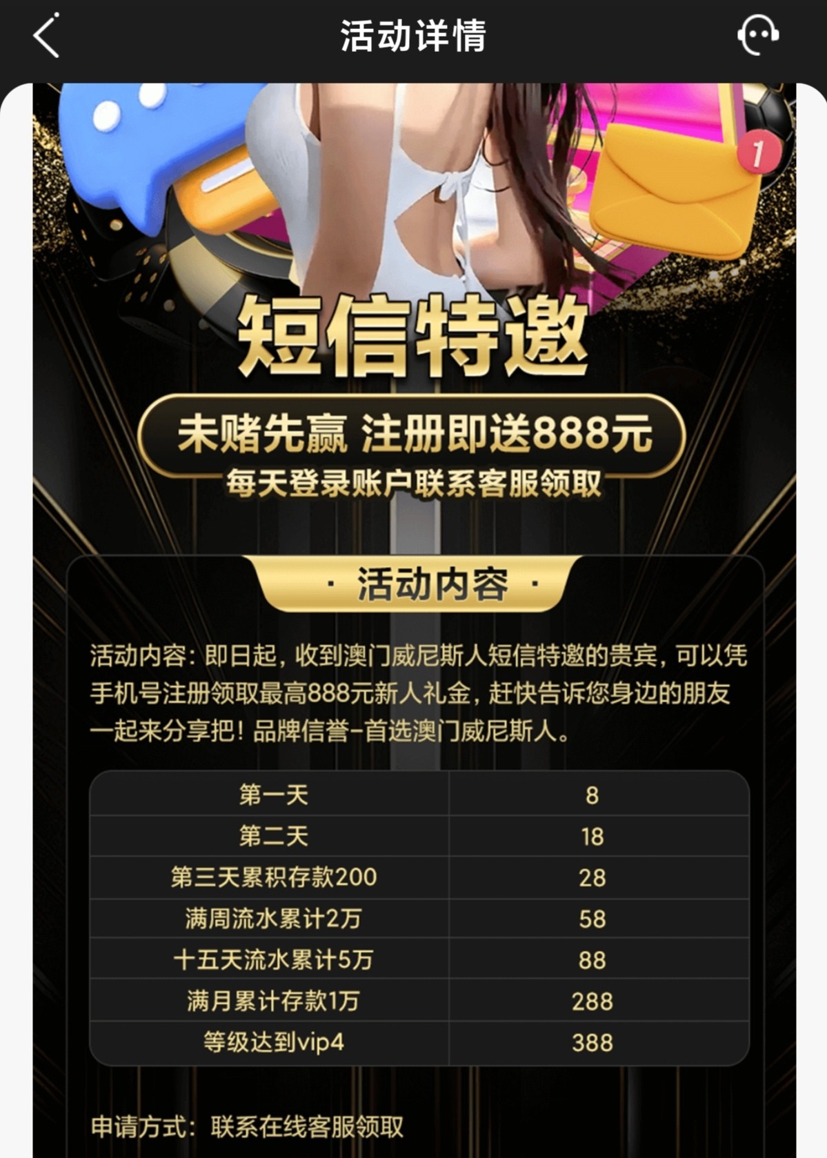 碰瓷短信特邀,第一天送8第二天送18都是联系在线客服申请,需要提供短信图(可以自己做)/手机号/账号,注册好了绑定银行卡去联系在线客服申请短信特邀彩金,亲测!