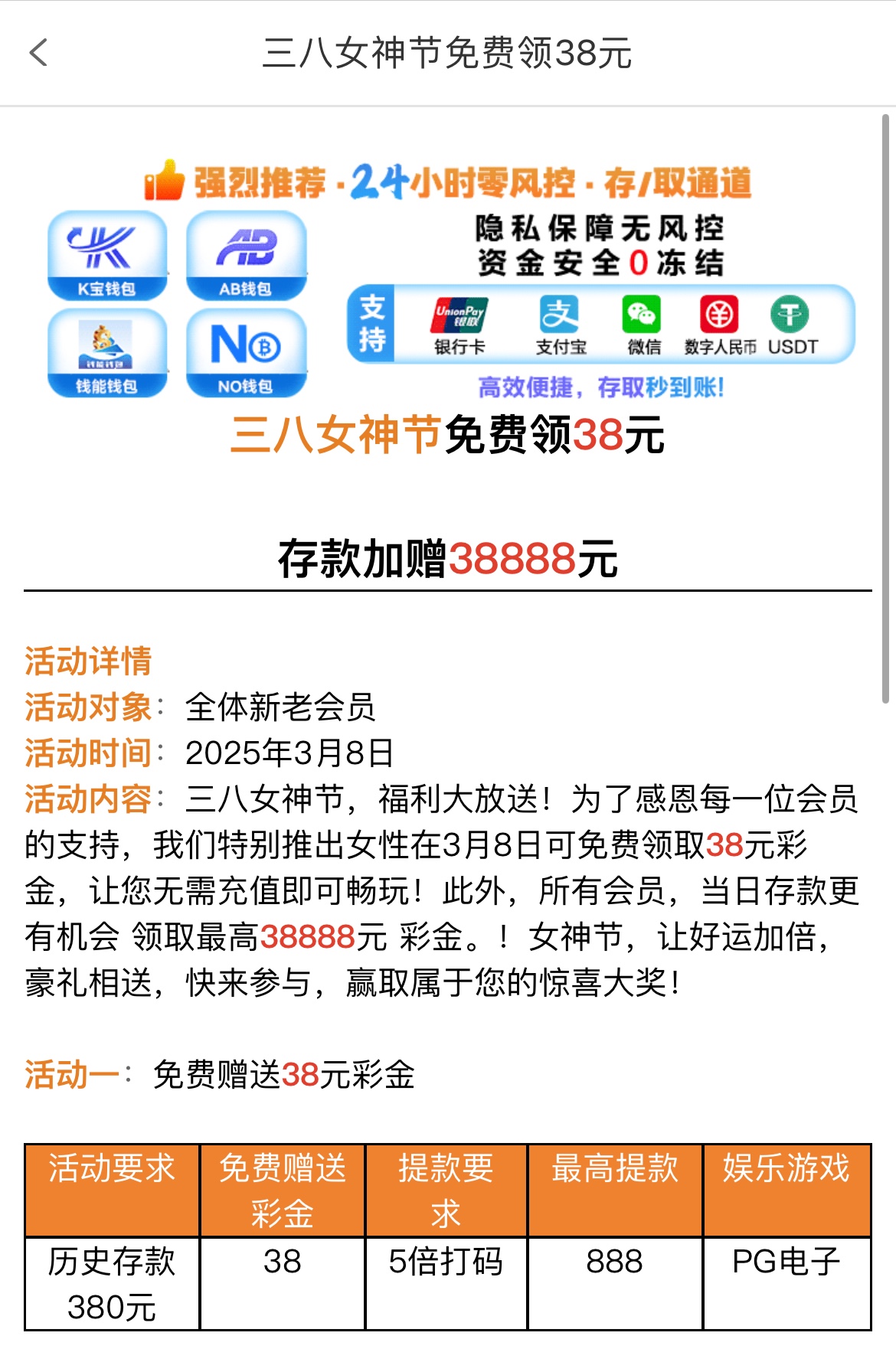 3月8号历史存款388以上回馈38彩金,满足要求的兄弟8号那天上号领,5倍流水,最高提888,限PG电子