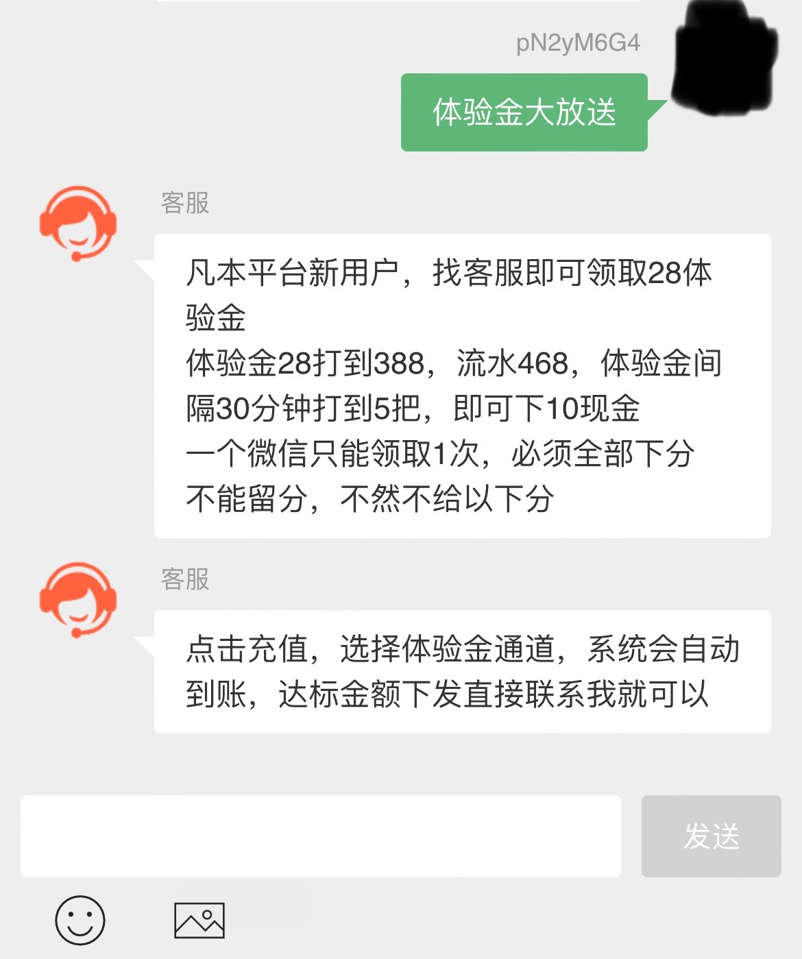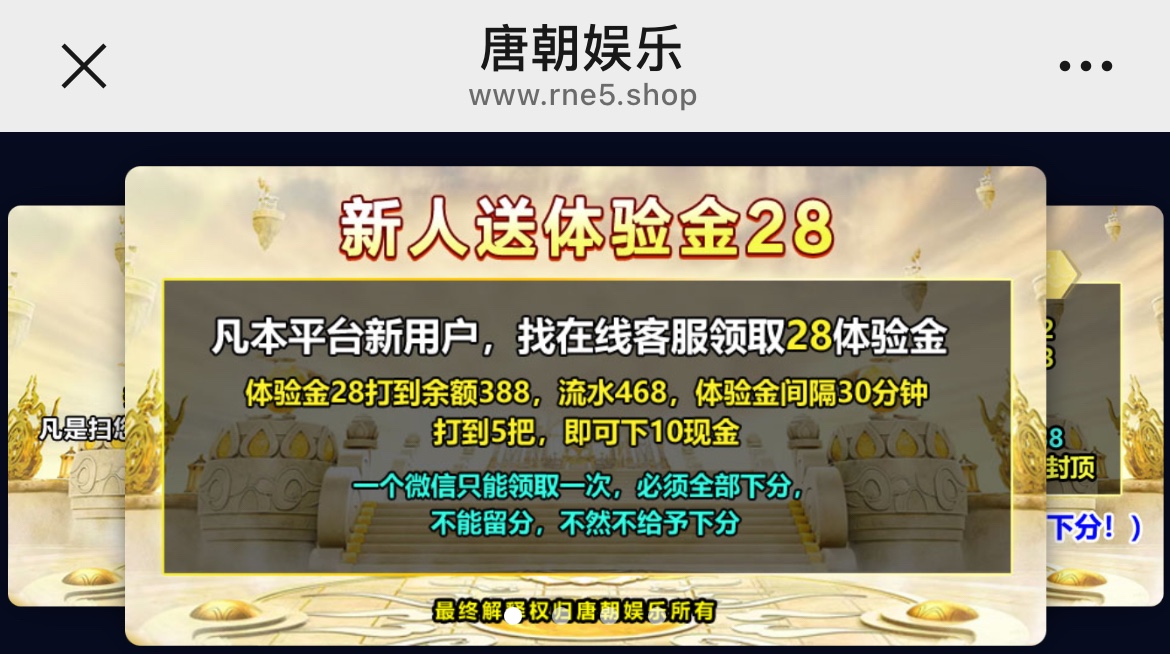 微信扫码,在充值里有体验金里面输入28秒送的,体验金28打到388,流水468,体验金间隔30分钟打到5把,即可下10现金