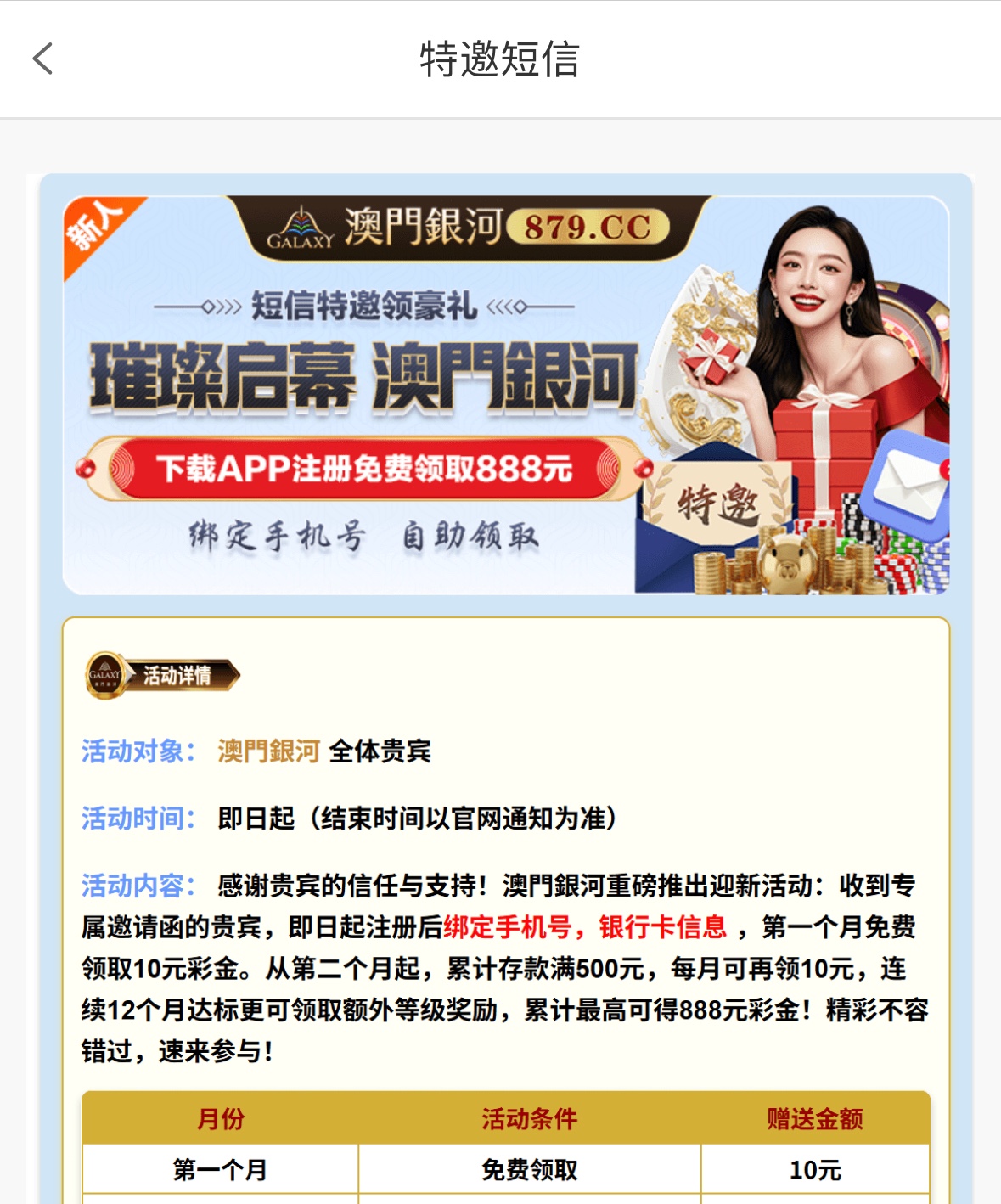 注册绑定手机号银行卡信息第一个月免费申请10彩金后面要充值才送