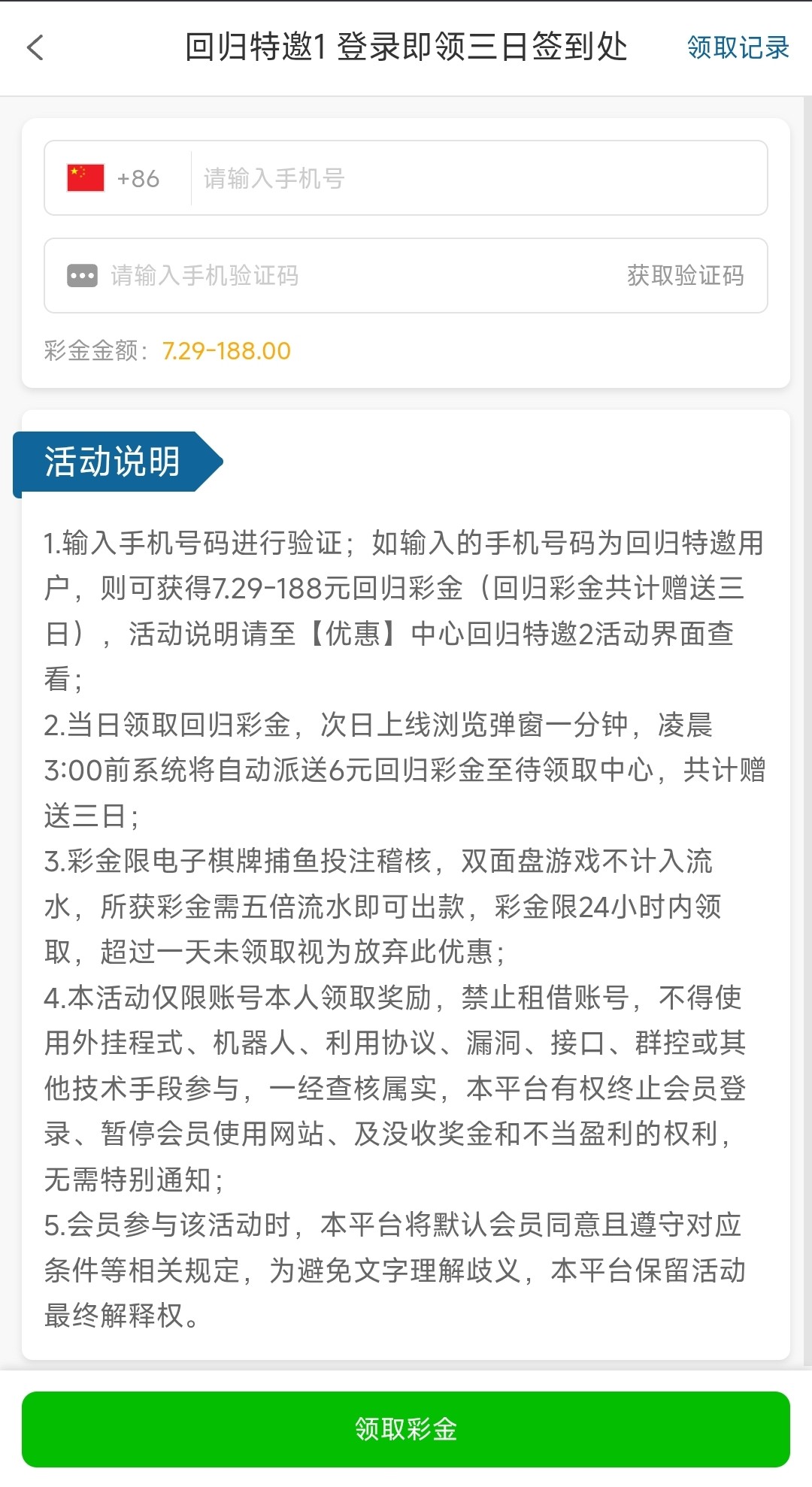 以前领过特邀彩金的哥们可以上号在优惠里领取一下看在不在回归名单里,彩金可以领三天,仅限“电子/棋牌/捕鱼”,五倍流水出款,注意容易空汇