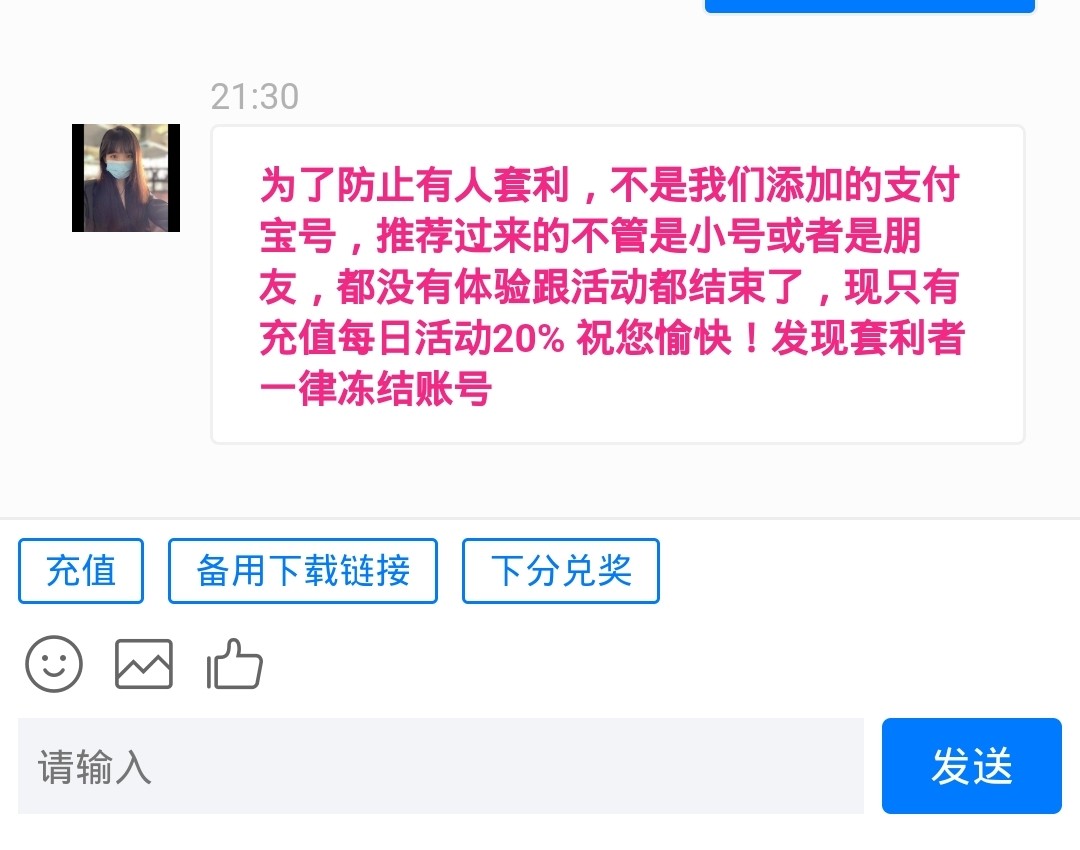 为了防止有人套利,不是我们添加的支付宝号,推荐过来的不管是小号或者是朋友,都没有体验跟活动都结束了,现只有充值每日活动20% 祝您愉快!